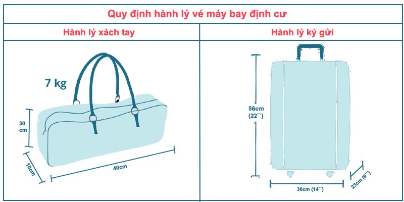 Hành lý xác tay : Hành lý xách tay đối với trường hợp vé máy bay định cư cũng giống như các hành trình bay thường, trọng lượng không được vượt quá 7kg, tổng số đo chiều dài + rộng + cao không được quá 115cm.